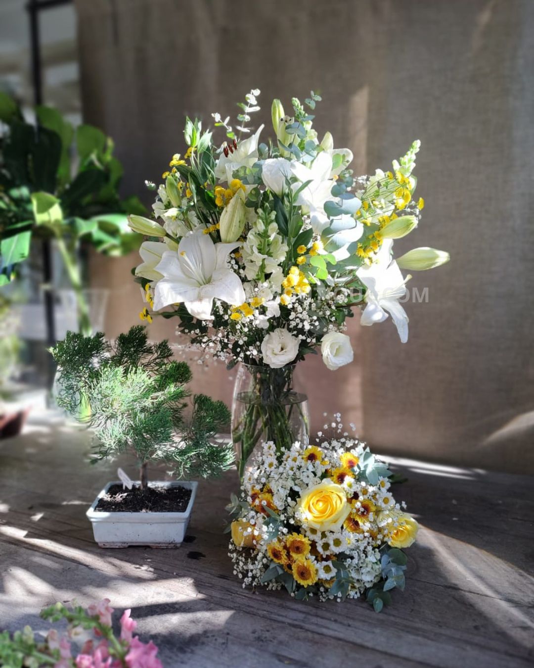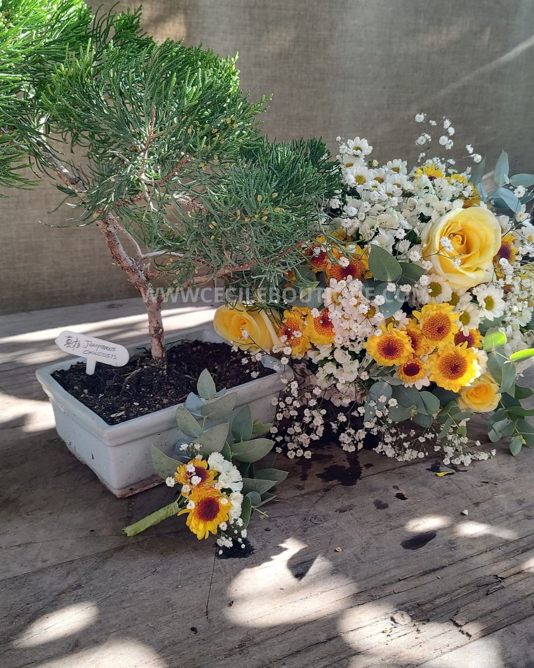 En el corazón del otoño, cuando las hojas doradas caen y el aire se tiñe de una frescura nostálgica, nuestro conjunto Reina de Mayo llega para celebrar la magia de esta temporada. Este exquisito set, compuesto por ramos florales, elegantes boutonnières y un sereno bonsái, es mucho más que un regalo.